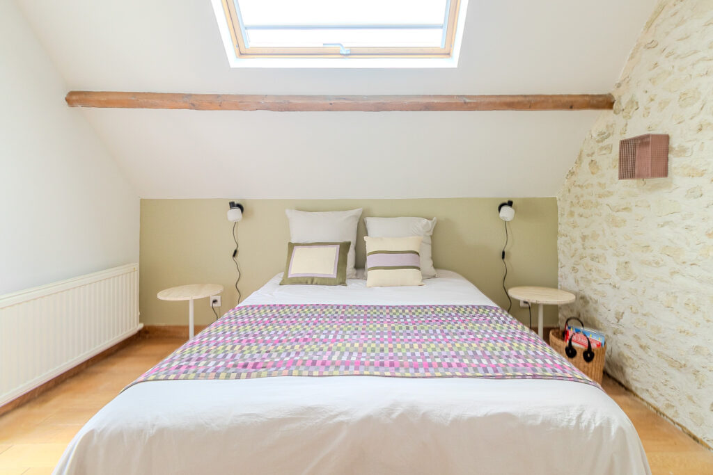 Une 2ème chambre à l’étage et sous les toits très lumineuse avec une belle hauteur sous plafond. Le mur en pierre apparente apporte une touche authentique et chaleureuse, tandis que les nuances douces et naturelles créent une atmosphère reposante.