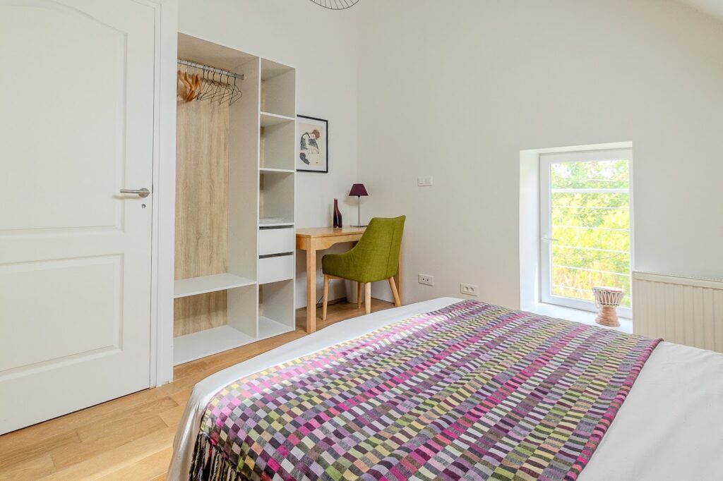 Équipée d’un lit double, d’un bureau et d’un espace de rangement, cette chambre allie confort et sobriété. Elle est idéale pour un séjour tout en douceur au cœur du Perche.